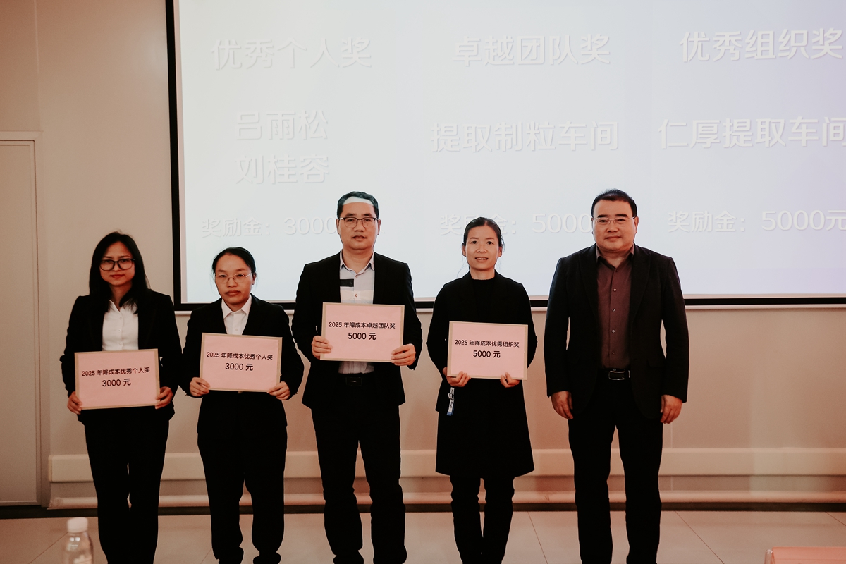 为表彰先进、鼓舞士气,会议对2025年降本硬仗中表现突出的个人和团队进行表彰。吕雨松、刘桂容荣获优秀个人奖;提取制粒车间荣获卓越团队奖;仁厚提取车间荣获优秀组织奖。玉林制药董事长兼总经理郭国荣为获奖代表颁奖,勉励大家珍惜荣誉、再接再厉,持续发挥标杆示范作用。