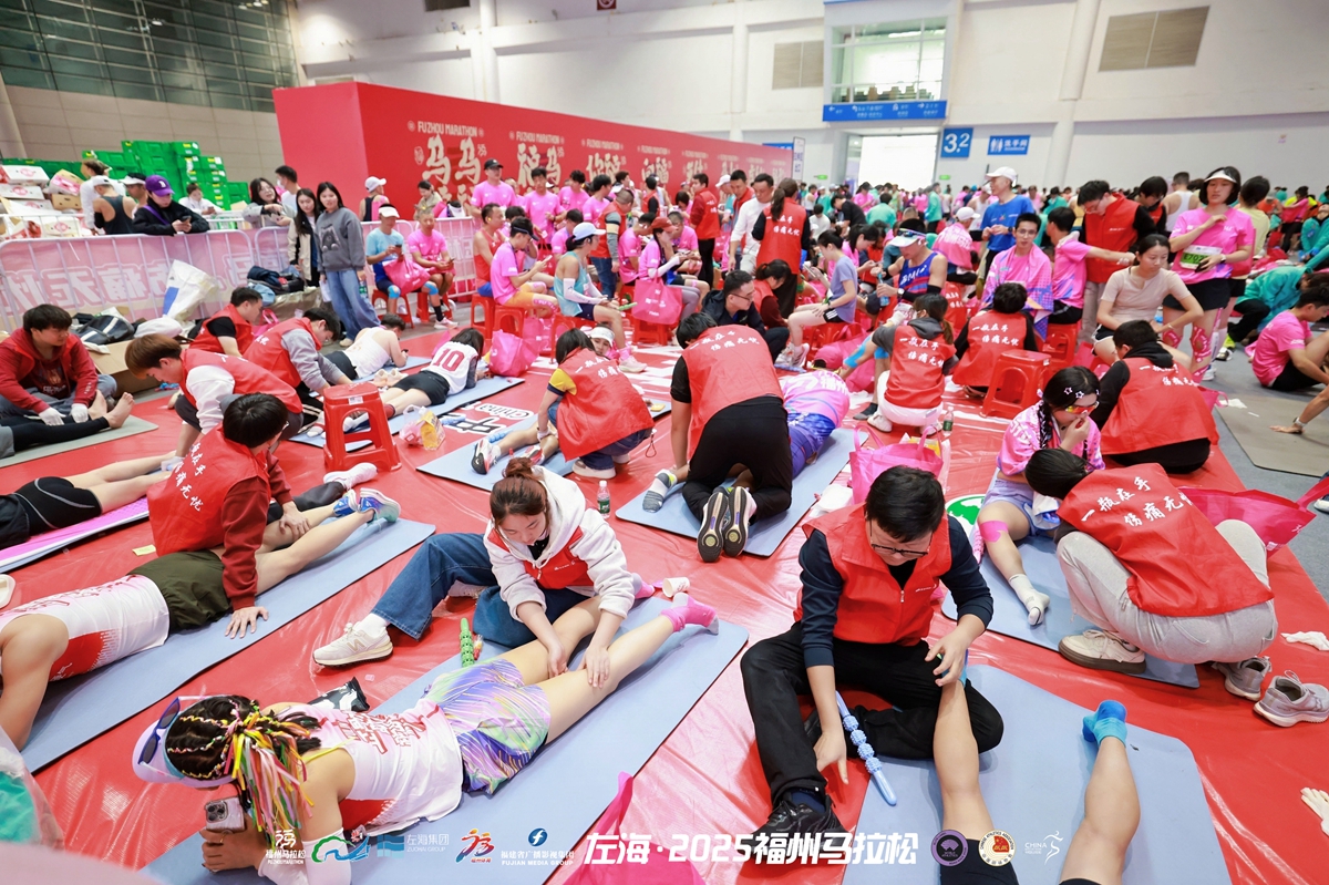 图 | 海峡国际会展中心终点区,工作人员为跑者提供暖心服务