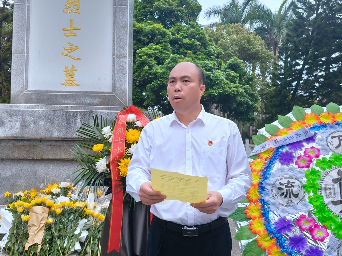 玉林制药党委书记兼工会主席石勇新发表讲话。他指出,朱锡昂烈士是中华民族的英雄,是我们身边的红色榜样,我们缅怀先烈,不仅是为了铭记峥嵘岁月,致敬不朽英雄,更是为了传承红色基因,赓续精神血脉,继承和发扬先烈们的优良传统和崇高风范。他强调,全体党员要以此次活动为契机,时刻铭记入党宣誓时的初心与誓言,以革命先烈为精神标杆,把革命先烈的精神力量融入岗位,凝心聚力,开拓创新,艰苦奋斗,为标杆,为先锋,以点滴之力汇聚成磅礴力量,推动公司高质量发展,为国家建设、社会进步贡献玉药力量。